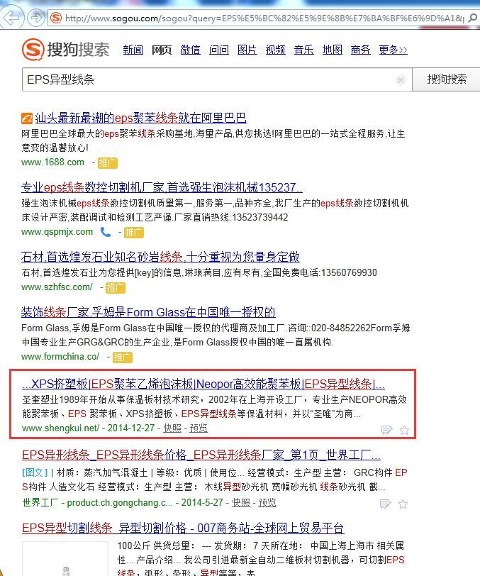 關(guān)鍵詞“EPS異形線條”在搜狗排名:首頁(yè)第一條;排在 4個(gè)付費(fèi)推廣之后,好熱門的詞,我們點(diǎn)擊不用錢,人家要花費(fèi)多多,呵呵。。。